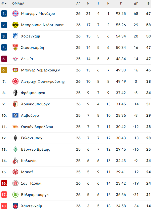 Στα υπόλοιπα παιχνίδια, η Ντόρτμουντ επικράτησε 2-0 της Άουγκσμπουργκ και μείωσε τη διαφορά από την κορυφή, ενώ η Άιντραχτ Φρανκφούρτης επικράτησε με σκορ 1-0 της Χάιντενχαϊμ.