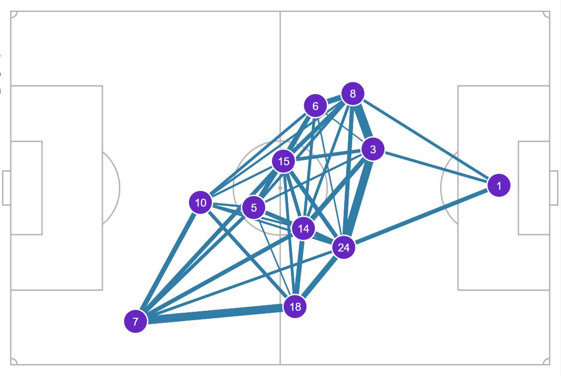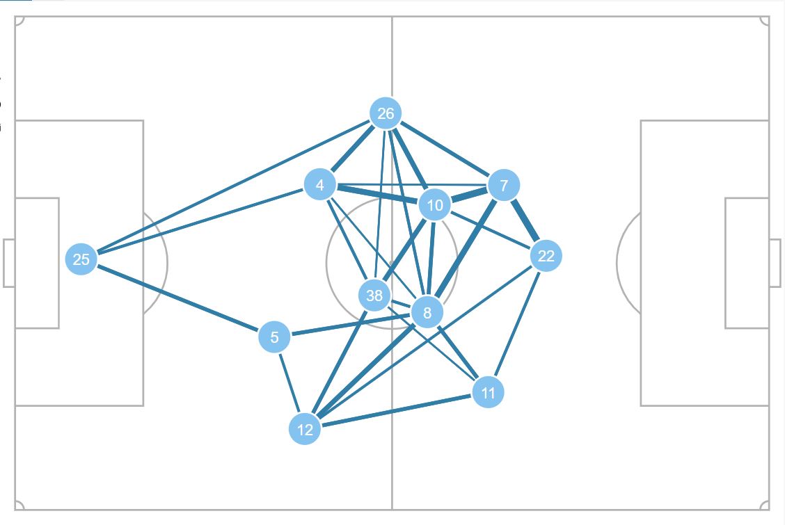 Η Ρεάλ μοιάζει εγκλωβισμένη στα… τερτίπια του Βινίσιους και αυτό φάνηκε και στην τοποθέτηση των παικτών του Τσάμπι Αλόνσο στον αγωνιστικό χώρο. Σύμφωνα με το παρακάτω γράφημα της Opta, που δείχνει τις πάσες μεταξύ των ποδοσφαιριστών και που πραγματοποιούν τις ενέργειές τους με τη μπάλα οι παίκτες κατά μέσο όρο, η Βασίλισσα «έγερνε» προς τα αριστερά στο γήπεδο, με τον «Βίνι» να είναι πιο ψηλά από όλους στον αγωνιστικό χώρο.