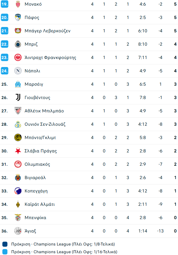 Δείτε πώς έχει διαμορφωθεί η βαθμολογία της League Phase του Champions League μετά την ολοκλήρωση της 4ης αγωνιστικής