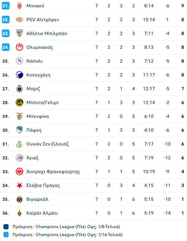 Οι Πειραιώτες βρίσκονται στους οκτώ βαθμούς (24η θέση) και ξέρουν πως με νίκη την ερχόμενη Τετάρτη (28/1, 22:00) στο Άμστερνταμ επί του Άγιαξ θα βρίσκονται δεδομένα στην κλήρωση της επόμενης Παρασκευής (30/1) για την ενδιάμεση φάση των νοκ-άουτ. Οι 11 πόντοι προφανώς δίνουν πρόκριση και μία καλή θέση στη League Phase.