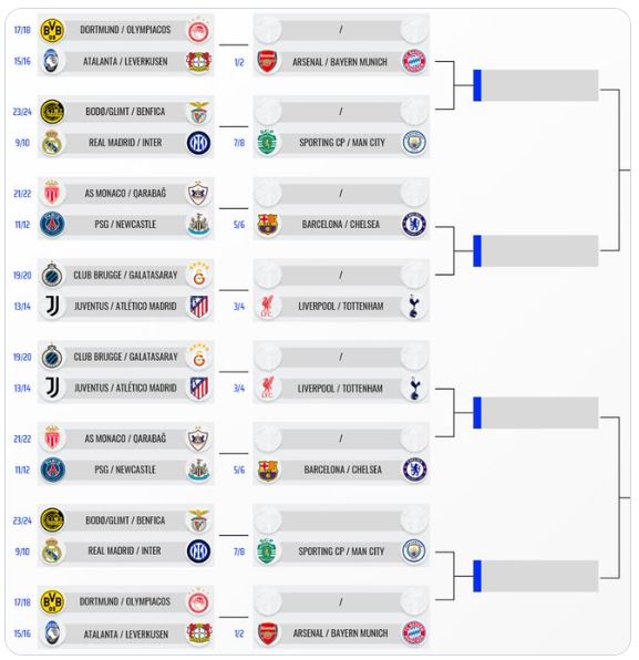Και δείχνει μεταξύ άλλων και τους δύο δρόμους του Ολυμπιακού που πλέον γνωρίζει τις συντεταγμένες: Με Αταλάντα ή Λεβερκούζεν για μια θέση στους «16». Και έπειτα με Άρσεναλ ή Μπάγερν Μονάχου για μια θέση στους προημιτελικούς.