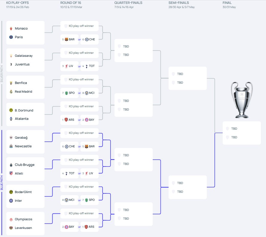 Στην περίπτωση που ο Ολυμπιακός προκριθεί επί τον Γερμανών, θα βρει στη φάση των «16» του Champions League, μία εκ των Άρσεναλ η Μπάγερν Μονάχου, που τερμάτισαν στην 1η και 2η θέση της League Phase, αντίστοιχα.