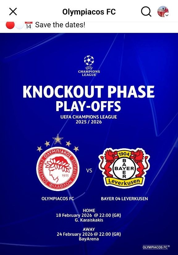 Η σχετική ανάρτηση με τις ημερομηνίες και τις ώρες των αγώνων του Ολυμπιακού με τη Λεβερκούζεν: