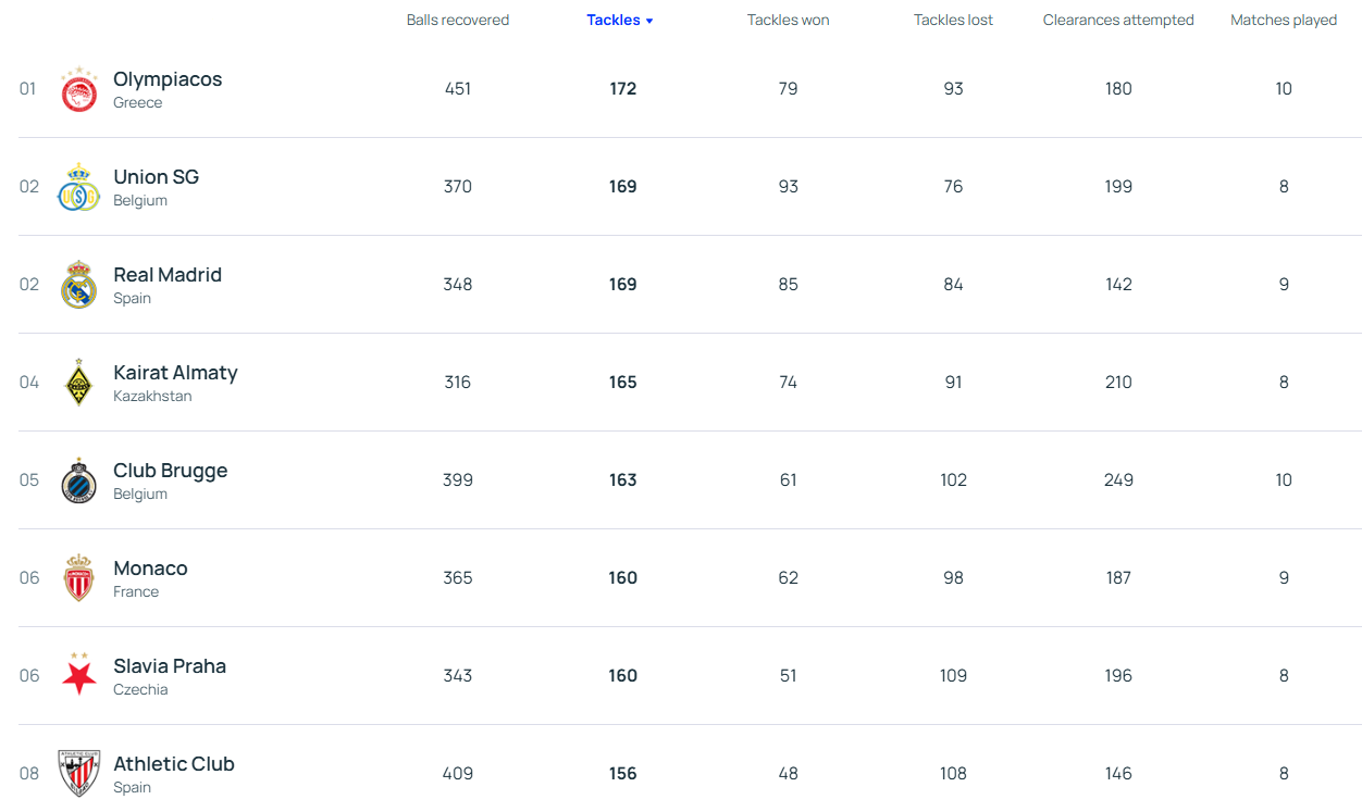 Παράλληλα, το σύνολο του Μεντιλίμπαρ είναι πρώτο και σε τάκλιν στο φετινό Champions League (172) πάνω από Ουνιόν Σεν Ζιλουάζ (169), Ρεάλ Μαδρίτης (169), Καϊράτ (165) και Μπριζ (163), που συμπληρώνει την πρώτη πεντάδα.
