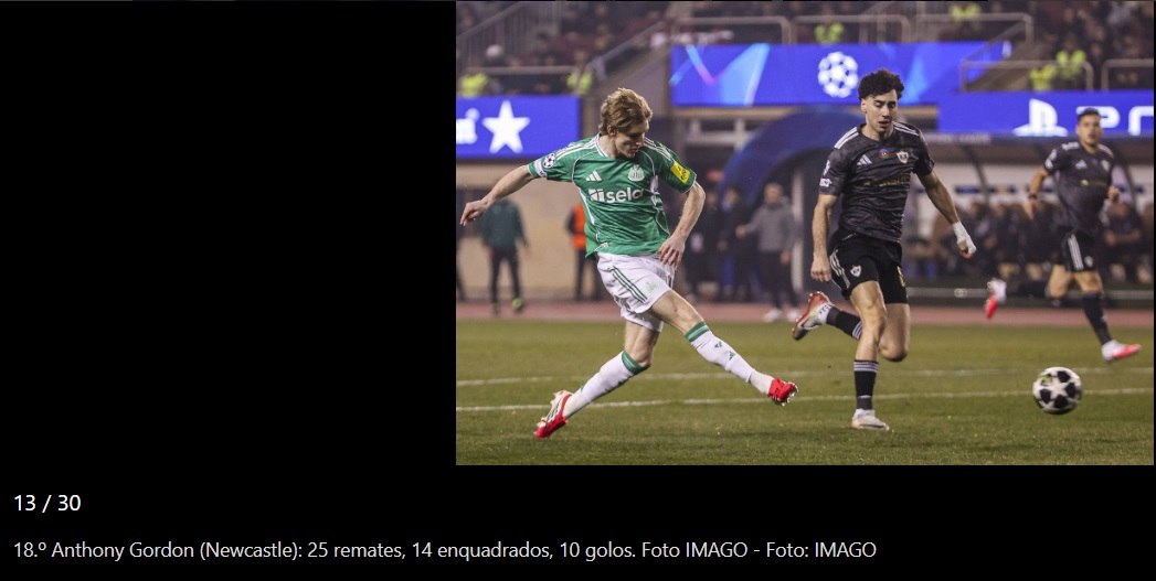 Από εκεί και πέρα η μεγάλη πορτογαλική ιστοσελίδα κάνει ειδική αναφορά στην αποτελεσματικότητα του Άντονι Γκόρντον της Νιουκάστλ, καθώς ο 25χρονος Άγγλος εξτρέμ των «ανθρακωρύχων» από τις 25 τελικές που έχει, οι 14 είναι στην εστία (δηλαδή ιδιαίτερα υψηλό ποσοστό), ενώ έχει βρει 10 φορές δίχτυα!