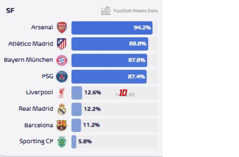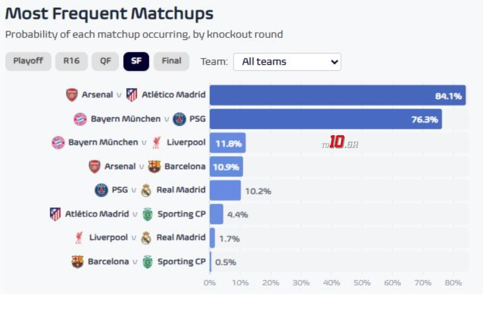 Κάπως έτσι, τα ζευγάρια των ημιτελικών θα είναι τα Άρσεναλ-Ατλέτικο, με 84,1% πιθανότητες και το Μπάγερν-Παρί κατά 76,3%.