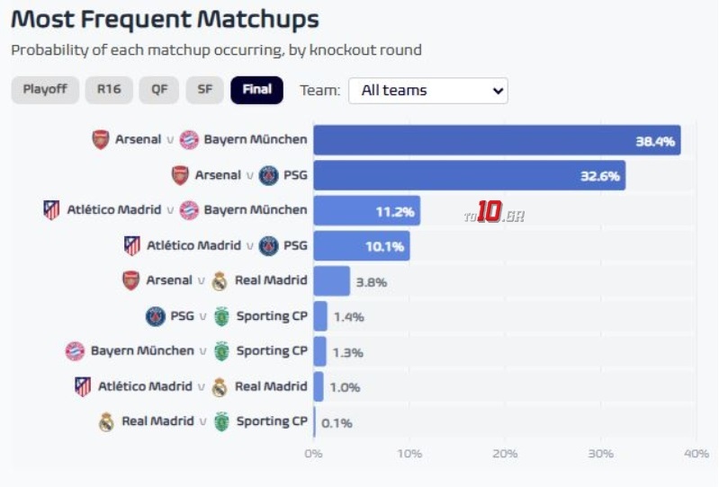 Κάπως έτσι, μετά από 20.000 προσομοιώσεις του Football Meets Data τα πιθανότερα ζευγάρια του μεγάλου τελικού που θα πραγματοποιηθεί στην Πούσκας Αρένα της Βουδαπέστης, στις 30 Μαΐου, είναι τα Άρσεναλ-Μπάγερν (38,4%) και Άρσεναλ-Παρί (32,6%). Λιγότερες πιθανότητες συγκεντρώνουν τα Ατλέτικο-Μπάγερν (11,2%) και Ατλέτικο-Παρί (10,1%).