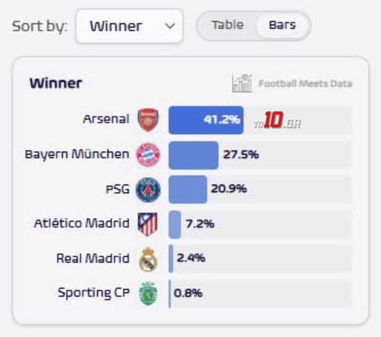 Τι λένε οι προσομοιώσεις του Football Meets Data: Πρώτο φαβορί παραμένει εδώ και καιρό η Άρσεναλ, που πλέον έχει 41,2% πιθανότητες κατάκτησης του Champions League, με Μπάγερν Μονάχου (27,5%) και Παρί (20,9%) να ακολουθούν πιο πίσω. Μονοψήφιες πιθανότητες έχουν οι ομάδες της Μαδρίτης, Ατλέτικο (7,2%) και Ρεάλ (2,4%).