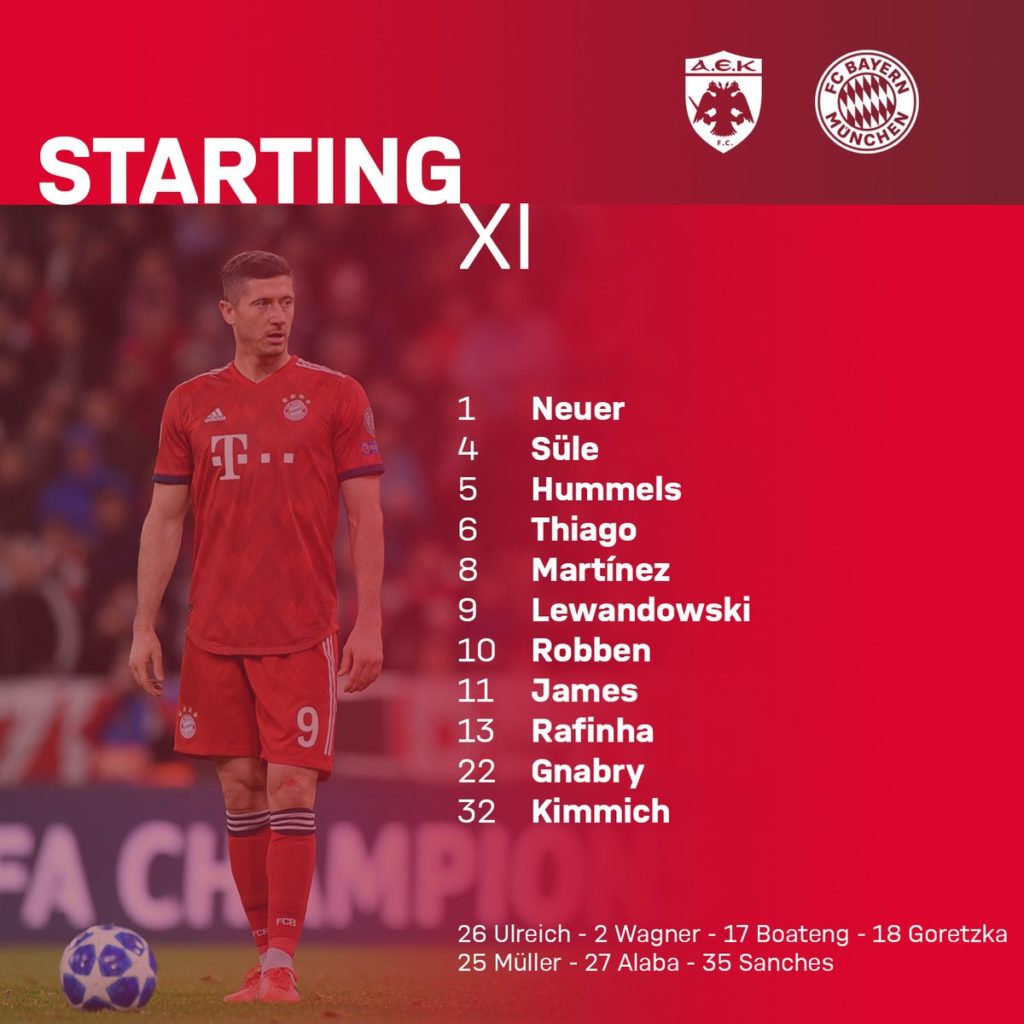Αναλυτικά: Νόιερ, Σούλε, Χούμελς, Τιάγκο, Μαρτίνεθ, Λεβαντόφσκι, Ρόμπεν, Χάμες, Ραφίνια, Γκνάμπρι, Κίμιχ.