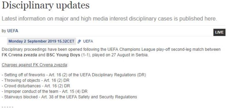 Όπως ανακοινώθηκε και επίσημα, η σέρβικη ομάδα κατηγορείται μεταξύ άλλων για άναμμα πυρσών, για αντικείμενα που πετάχτηκαν στον αγωνιστικό χώρο και για τη γενικότερη συμπεριφορά των οπαδών της.