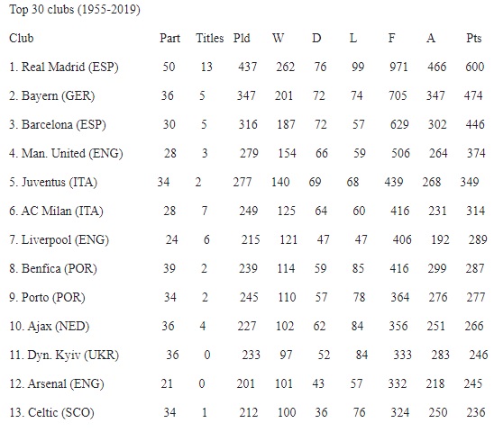 Αυτό αποδεικνύει και η UEFA μέσα από την επίσημη ιστοσελίδα της, όπου δημοσίευσε τη λίστα των 30 κορυφαίων συλλόγων που έχουν πάρει μέρος στο Κύπελλο πρωταθλητριών-Champions League σε όλη την ιστορία του, από το 1955 μέχρι και σήμερα.