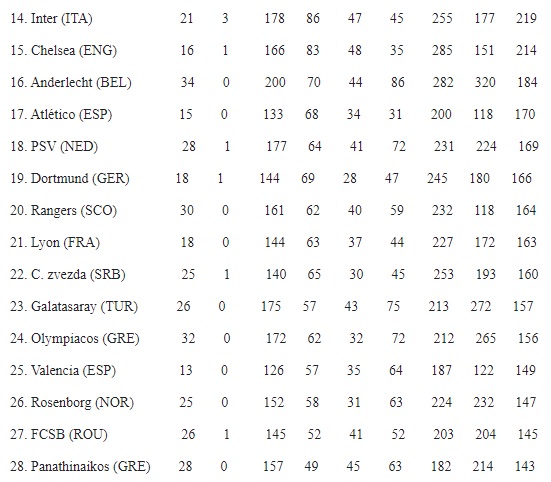 Η UEFA δημοσίευσε τη λίστα των 30 κορυφαίων συλλόγων που έχουν πάρει μέρος στην κορυφαία διασυλλογική διοργάνωση και ο Ολυμπιακός βρίσκεται στην 24η θέση. Τέσσερις θέσεις πιο κάτω ο Παναθηναϊκός