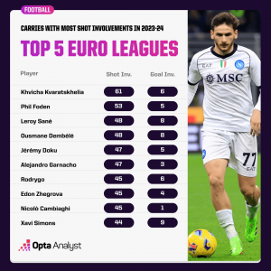 Εδώ, η πρωτιά του Κβαρατσχέλια είναι ξεκάθαρη ανάμεσα σε όλους τους παίκτες των πέντε κορυφαίων πρωταθλημάτων της Ευρώπης. Ο Γεωργιανός αστέρας, έχει κουβαλήσει την μπάλα 61 φορές και έχει βρεθεί να εκτελεί τελική ενέργεια, με 6 εξ’ αυτών να έχουν καταλήξει γκολ. Τα 4 τα σκόραρε ο ίδιος και για τα άλλα 2 έδωσε την ασίστ. Για την ιστορία, αρκετά κοντά βρίσκεται ο κορυφαίος παίκτης της φετινής Premier League, Φιλ Φόντεν (53).