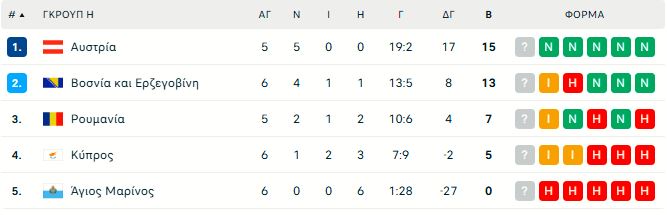 Στο άλλο ματς του ομίλου, η Αυστρία ισοπέδωσε με 1-0 το Σαν Μαρίνο και έκανε το 5Χ5 στον όμιλο. Με γκολ των Σμιντ (7’), Αρναούτοβιτς (8’), Γκρέκοριτς (24’), Ποτσχ (30’, 42’) και Λάιμερ (45’) η Αυστρία προηγήθηκε με 6-0 στο τέλος του πρώτου ημιχρόνου. Στο δεύτερο συνέχισε με το πόδι καρφωμένο στο γκάζι και με τέρματα των Αρανούτοβιτς (47’, 83’, 84’) και Βουρμπραντ (76’) έφτασε στο τελικό και άκρως εντυπωσιακό 10-0.