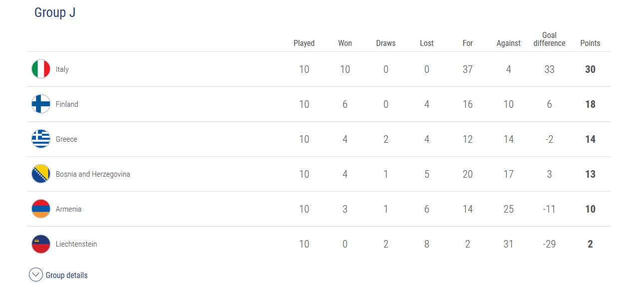 Στην πρώτη θέση του ομίλου τερμάτισε η Ιταλία, η οποία μάλιστα έκανε το απόλυτο! Η ομάδα του Ρομπέρτο Μαντσίνι δεν έχασε ούτε βαθμό, καθώς πέτυχε 10 νίκες και ολοκλήρωσε τα προκριματικά του Euro 2020 με 30 βαθμούς στο ενεργητικό της.