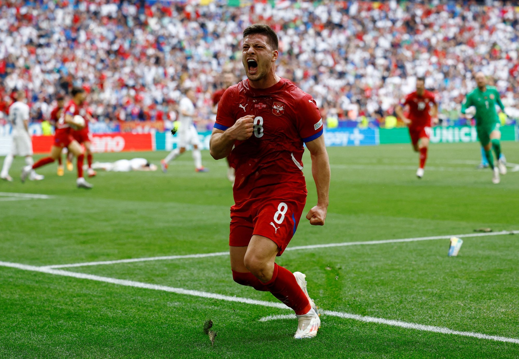 Ο Γιόβιτς είναι σέντερ που «έχει» αυτά τα γκολ, είναι δυνατό κορμί, καλός στο ψηλό παιχνίδι και αν παρατηρήσει κάποιος το ριπλέι, θα διαπιστώσει ότι αμυντικός της Σλοβενίας μαρκάρει και τραβάει απ’ την φανέλα τον Σέρβο στράικερ, αλλά ο Γιόβιτς βρήκε τρόπο να πάρει την κεφαλιά και να στείλει την μπάλα στα δίχτυα.
