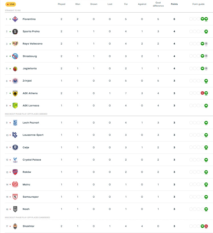 Τα αποτελέσματα και η βαθμολογία στο Europa Conference League μετά τα 10 πρώτα παιχνίδια για την 2η αγωνιστική της League Phase - Διπλασίασε τις νίκες της η Φιορεντίνα.
