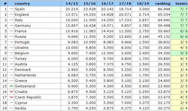 Στην 13η θέση παραμένει η Ολλανδία με 25.553 βαθμούς και στη 12η θέση είναι η Δανία με τρεις ομάδες και 25.900 βαθμούς. Αν η Ελλάδα διατηρήσει την 14η θέση μέχρι το τέλος της σεζόν, τότε τη σεζόν 2020-21 θα συνεχίζει να βγάζει τον πρωταθλητή στον 3ο προκριματικό του Champions League, ενώ ο δευτεραθλητής θα αγωνίζεται στο 2ο προκριματικό της κορυφαίας διασυλλογικής διοργάνωσης. Ο Κυπελλούχος θα μπαίνει στον 3ο προκριματικό του Europa και ο 3ος-4ος της βαθμολογίας στον 2ο προκριματικό του Europa.