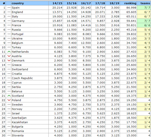Αν η Ελλάδα διατηρήσει την 14η θέση ή ανέβει στην 13η μέχρι το τέλος της σεζόν, τότε τη σεζόν 2020-21 θα συνεχίζει να βγάζει τον πρωταθλητή στον 3ο προκριματικό του Champions League, ενώ ο δευτεραθλητής θα αγωνίζεται στο 2ο προκριματικό της κορυφαίας διασυλλογικής διοργάνωσης. Ο Κυπελλούχος θα μπαίνει στον 3ο προκριματικό του Europa και ο 3ος-4ος της βαθμολογίας στον 2ο προκριματικό του Europa.