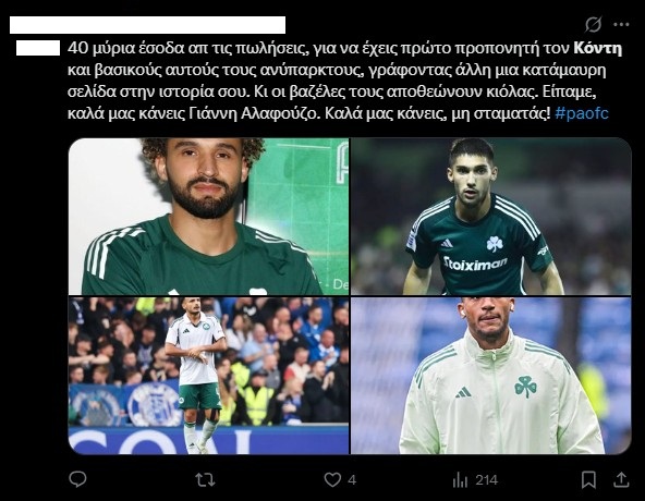 Οι οπαδοί του Παναθηναϊκού ξέσπασαν στο Χ μετά την ήττα από την Γκόου Αχέντ Ινγκλς, βάζοντάς τα με τον Χρήστο Κόντη, τον Γιάννη Αλαφούζο και τους χειρισμούς τους στους «πράσινους».