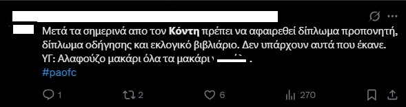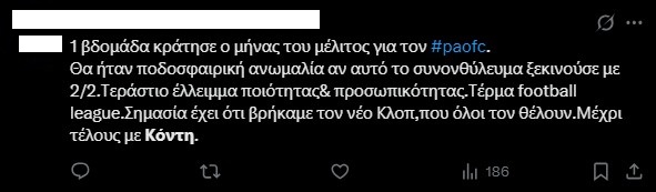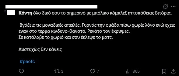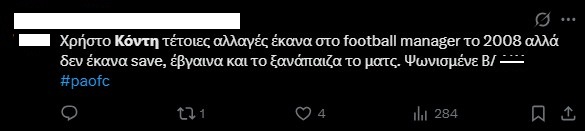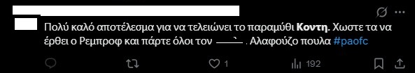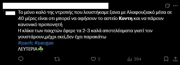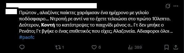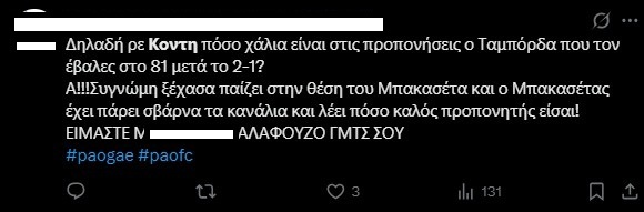 Στο ίδιο μήκος κύματος ήταν και οι χρήστες του Χ, οι οποίοι με τον δικό τους τρόπο σχολίασαν όσα συνέβησαν. Η μεγαλύτερη μερίδα τάχθηκε κατά των επιλογών του Χρήστου Κόντη για τις αλλαγές. Παράλληλα, τα «πυρά» έπεσαν μοιραία και στον ιδιοκτήτη της ομάδας, ενώ σχολιάστηκε η συνολική εικόνα του συλλόγου όλα αυτά τα χρόνια.