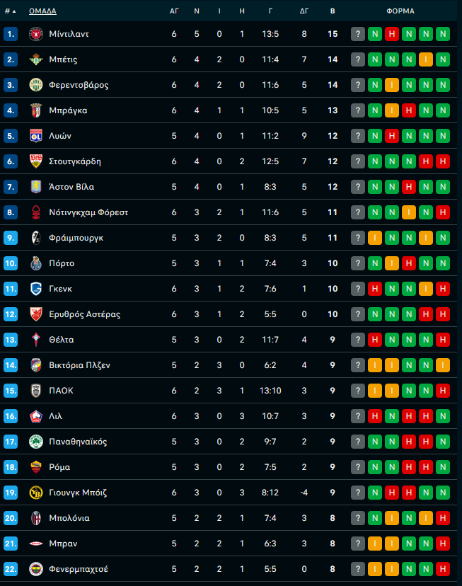 Το ματς της βραδιάς ήταν χωρίς αμφιβολία αυτό της Λουντογκόρετς με τον ΠΑΟΚ, με τον Δικέφαλο του βορρά να γλιτώνει στο φινάλε και να έρχεται ισόπαλος με 3-3 χάρη σε τέρμα του Μύθου στο φινάλε του ματς. Με αυτό τον βαθμό έφτασε τους 9 στη League Phase και με δύο αγωνιστικές να απομένουν είναι στην 15η θέση, χωρίς όμως να έχουν γίνει τα ματς των 22:00.
