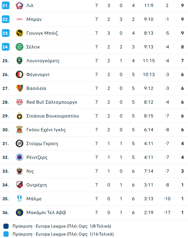 Η Ρόμα επιβλήθηκε με 2-0 της Στουτγκάρδης και είναι... αγκαλιά με την οκτάδα ενώ η Θέλτα προκρίθηκε στα πλέι οφ με το 2-1 επί της Λιλ. Η βαθμολογία της League Phase.