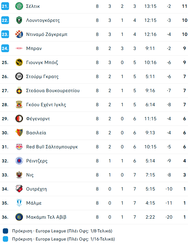 Ολοκληρώθηκε η League Phase του φετινού UEFA Europa League, με τη διεξαγωγή της 8ης και τελευταίας αγωνιστικής το βράδυ της Πέμπτης (29/1).