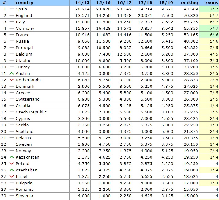 Να αναφέρουμε ότι εφόσον η Ελλάδα διατηρηθεί τη 14η θέση (είτε αναρριχηθεί στην 13η) ως το τέλος της χρονιάς, τότε θα συνεχίσει να βγάζει τον πρωταθλητή στον 3ο προκριματικό του Champions League και τη σεζόν 2020-21,τον δευτεραθλητή στο 2ο προκριματικό (Champions League), τον Κυπελλούχο στον 3ο προκριματικό του Europa League και τον τρίτο – τέταρτο της βαθμολογίας στον 2ο προκριματικό του Europa League.