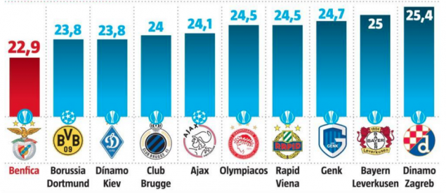 Η πορτογαλική εφημερίδα Record συνέκρινε τις ενδεκάδες των 40 ομάδων που αγωνίστηκαν αυτή την εβδομάδα σε Champions και Europa League (εκκρεμούν ακόμα 4 ζευγάρια στην κορυφαία διασυλλογική διοργάνωση) και τα συμπεράσματά της φέρνουν χαμόγελα στο Λιμάνι, με τον Ολυμπιακό να βρίσκεται στην 6η θέση! Αξίζει ωστόσο να αναφέρουμε ότι η αντίπαλός του στη φάση των «32», Ντιναμό Κιέβου, είναι στην τρίτη θέση της σχετικής λίστας με μέσο όρο ηλικίας τα 23,8! Νεαρότερη ενδεκάδα αυτήν την εβδομάδα στα ευρωπαϊκά πρωταθλήματα ήταν εκείνη της Μπενφίκα (με αντίπαλο την Γαλατασάραι) με μέσο όρο ηλικίας τα 22,9 έτη.