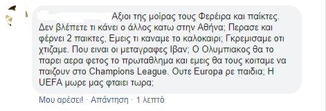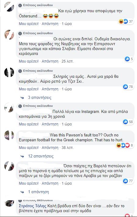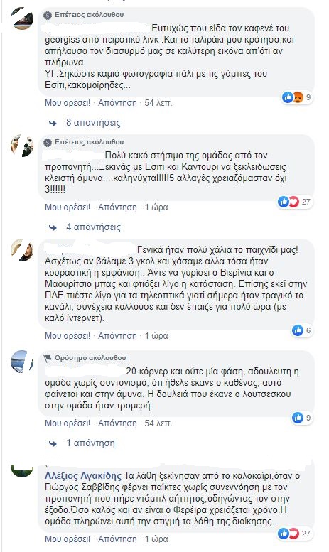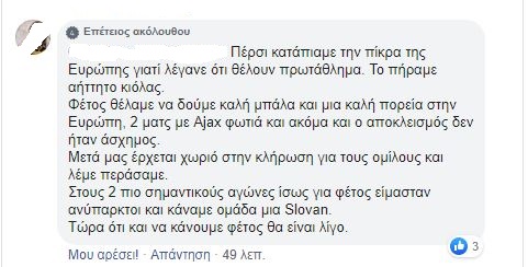«Συνέχισε με 4-4-2 και Πέλκα μέσα… άξιοι της μοίρας μας. Τώρα θα φταίει η uefa mafia που του χρόνου θα είμαστε στο 4ο γκρουπ. Τώρα βλέπε Ολυμπιακό μέχρι τον Δεκέμβριο»
