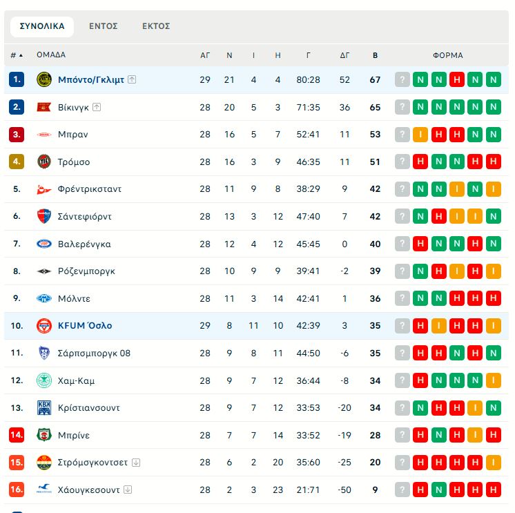 Συνεχίζεται η μάχη του τίτλου στη Νορβηγία, με την Μπόντο Γκλιμτ να επικρατεί εκτός έδρας της KFUM με 2-1, για την 29η και προτελευταία αγωνιστική του νορβηγικού πρωταθλήματος και να ανεβαίνει στην κορυφή με 67 πόντους έναντι 65 βαθμών της Βίκινγκ, που δοκιμάζεται την Κυριακή στην έδρα της Φρέντρικσταντ (23/11, 20:15).