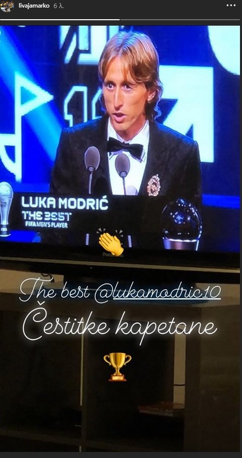 Ο διεθνής Κροάτης επιθετικός της ΑΕΚ, Μάρκο Λιβάγια, ανέβασε στον προσωπικό του λογαριασμό στο instagram ένα πλάνο από την βράβευση του Λούκα Μόντρις ως κορυφαίου ποδοσφαιριστή στον κόσμο (για πρώτη φορά μετά από μια δεκαετία κυριαρχίας των Λιονέλ Μέσι- Κριστιάνο Ρονάλντο) συγχαίροντας τον για την επιτυχία του. Συγκεκριμένα ο 26χρονος άσος της Ένωσης, έγραψε: «Λούκα Μόντριτς, ο καλύτερος. Συγχαρητήρια, αρχηγέ».