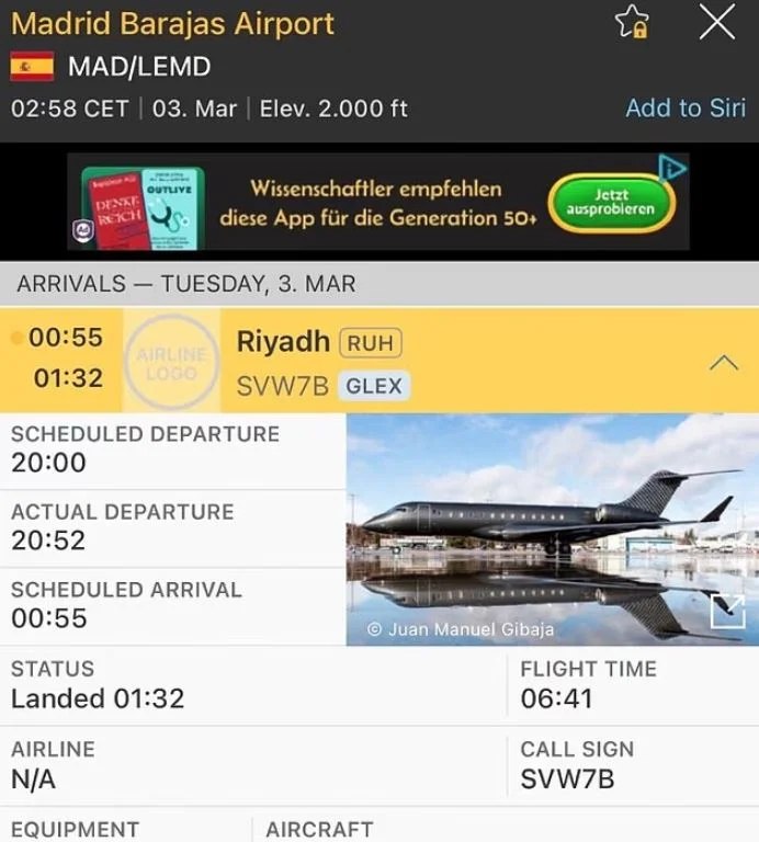 Σύμφωνα με δεδομένα παρακολούθησης πτήσεων, το Bombardier Global Express πραγματοποίησε το σχεδόν επτάωρο ταξίδι προς την ισπανική πρωτεύουσα αναχωρώντας στις 20:20 και προσγειώθηκε λίγο πριν τη μία τα ξημερώματα.