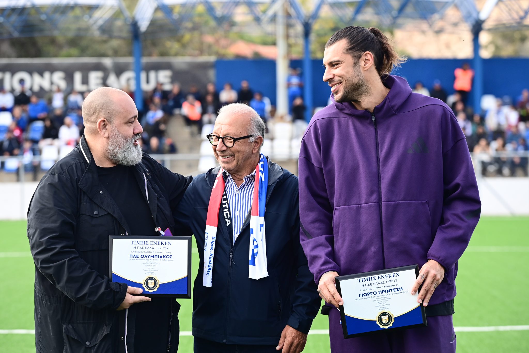 Συγκεκριμένα, η διοίκηση της ομάδας βράβευσε τον αντιπρόεδρο της ερυθρόλευκης ΠΑΕ, Κώστα Καραπαπά, αλλά και τον θρύλο του μπασκετικού Ολυμπιακού και γέννημα θρέμμα της Σύρου, Γιώργο Πρίντεζη.