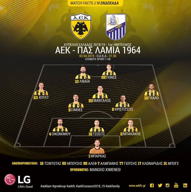 Συγκεκριμένα η ΑΕΚ θα παραταχθεί με τον Μπάρκα κάτω από τα δοκάρια και τους Οικονόμου, Τσόσιτς και Μπακάκη στην τριάδα της άμυνας. Στον άξονα θα υπάρχει η τριάδα των Μάνταλου, Σιμόες και Κρίστισιτς, ενώ τις πλευρές θα πάρουν οι Χουλτ και Γκάλο. Αιχμή του δόρατος θα είναι ο Εζέκιελ Πόνσε ενώ περιφερειακά στο πλευρό του θα κινείται ο Μάρκο Λιβάγια.