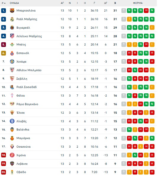 Νωρίτερα, ισόπαλο χωρίς γκολ έληξε το ματς στο Οβιέδο μεταξύ της τοπικής Ρεάλ και της Βαγιεκάνο, με την ουραγό της βαθμολογίας να παίζει μάλιστα στο μεγαλύτερο διάστημα του β’ ημιχρόνου με δέκα παίκτες, λόγω αποβολής του Τσάιρα (53′).