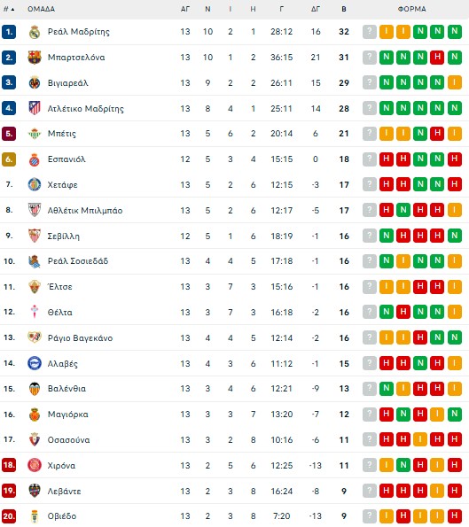 Αυτή μάλιστα ήταν η δεύτερη σερί απώλεια για τη «βασίλισσα» στο πρωτάθλημα, ωστόσο κατάφερε να παραμείνει στην κορυφή της βαθμολογίας με 32 βαθμούς, μόλις όμως στο +1 από τη δεύτερη Μπαρτσελόνα, το +3 από την τρίτη Βιγιαρεάλ και το +4 από την τέταρτη Ατλέτικο Μαδρίτης.