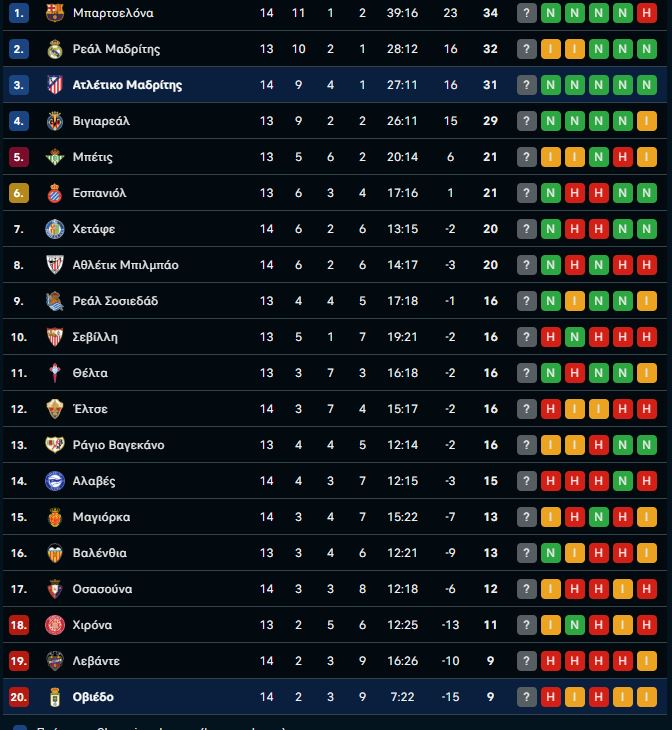 Οι «ροχιμπλάνκος» με αυτή τη νίκη πάτησαν στην τρίτη θέση, έχοντας 31 βαθμούς και βρίσκονται στο -3 από την πρωτοπόρο Μπαρτσελόνα μετά από 14 αγωνιστικές στη La Liga. Οι φιλοξενούμενοι με αυτή τους την ήττα παραμένουν στην τελευταία θέση του βαθμολογικού πίνακα με μόλις εννέα βαθμούς.