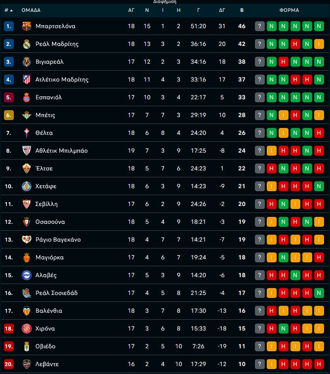 Υπενθυμίζεται ότι νωρίτερα στο 1-1 έμειναν, Οσασούνα και Αθλέτικ Μπιλμπάο στην Παμπλόνα, στο πλαίσιο της 18ης αγωνιστικής της LaLiga. Ο βαθμός δεν άφησε ικανοποιημένους τους γηπεδούχους, που ήθελαν περισσότερο το «τρίποντο» για να απομακρυνθούν ακόμη περισσότερο από τις τελευταίες θέσεις της βαθμολογίας.