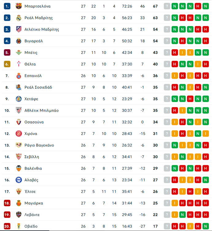 Κάθε επαφή με την τετράδα της La Liga έχασε η Μπέτις. Η Χετάφε επικράτησε με 2-0 της ομάδας του Μανουέλ Πελεγκρίνι για την 27η αγωνιστική του πρωταθλήματος και την άφησε 11 βαθμούς πίσω από τη Βιγιαρεάλ που νωρίτερα νίκησε με 2-1 την Έλτσε και έπιασε ξανά την Ατλέτικο στην τρίτη θέση.