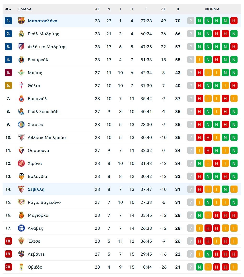 Μια άκρως εντυπωσιακή και αποτελεσματική Μπαρτσελόνα, σκόρπισε στους… πέντε ανέμους τη Σεβίλλη (5-2) στο ματς της 28ης αγωνιστικής της La Liga και επέστρεψε στο +4 από τη Ρεάλ Μαδρίτης, δείχνοντας τις… άγριες διαθέσεις της για να μην αφήσει τον φετινό τίτλο να ξεφύγει μέσα από τα χέρια της. Αυτή ήταν η 4η σερί νίκη για την ομάδα του Χάνσι Φλικ στο ισπανικό πρωτάθλημα, την ώρα που οι Ανδαλουσιάνοι υπέστησαν την πρώτη τους ήττα μετά από ένα διάστημα 5 αγωνιστικών που μετρούσαν 4 ισοπαλίες και 1 νίκη. Ωστόσο, παραμένουν χαμηλά στη βαθμολογία (σ.σ. 14η θέση με 31β) και σίγουρα ο κίνδυνος δεν έχει απομακρυνθεί, αφού η ζώνη του υποβιβασμού απέχει μόλις 5 βαθμούς.