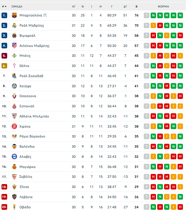 Καταστροφική ισοπαλία για τη Ρεάλ Μαδρίτης απέναντι στην Χιρόνα για την 31η αγωνιστική της La Liga, με το 1-1 στο Μπερναμπέου να αφήνει τη Βασίλισσα στο -6 από την πρωτοπόρο Μπαρτσελόνα, που έχει και ένα παιχνίδι λιγότερο. Η ομάδα του Φλικ υποδέχεται το Μ. Σάββατο την Εσπανιόλ στο Καμπ Νου (19:30). Στους 38 και στην 12η θέση η Χιρόνα.