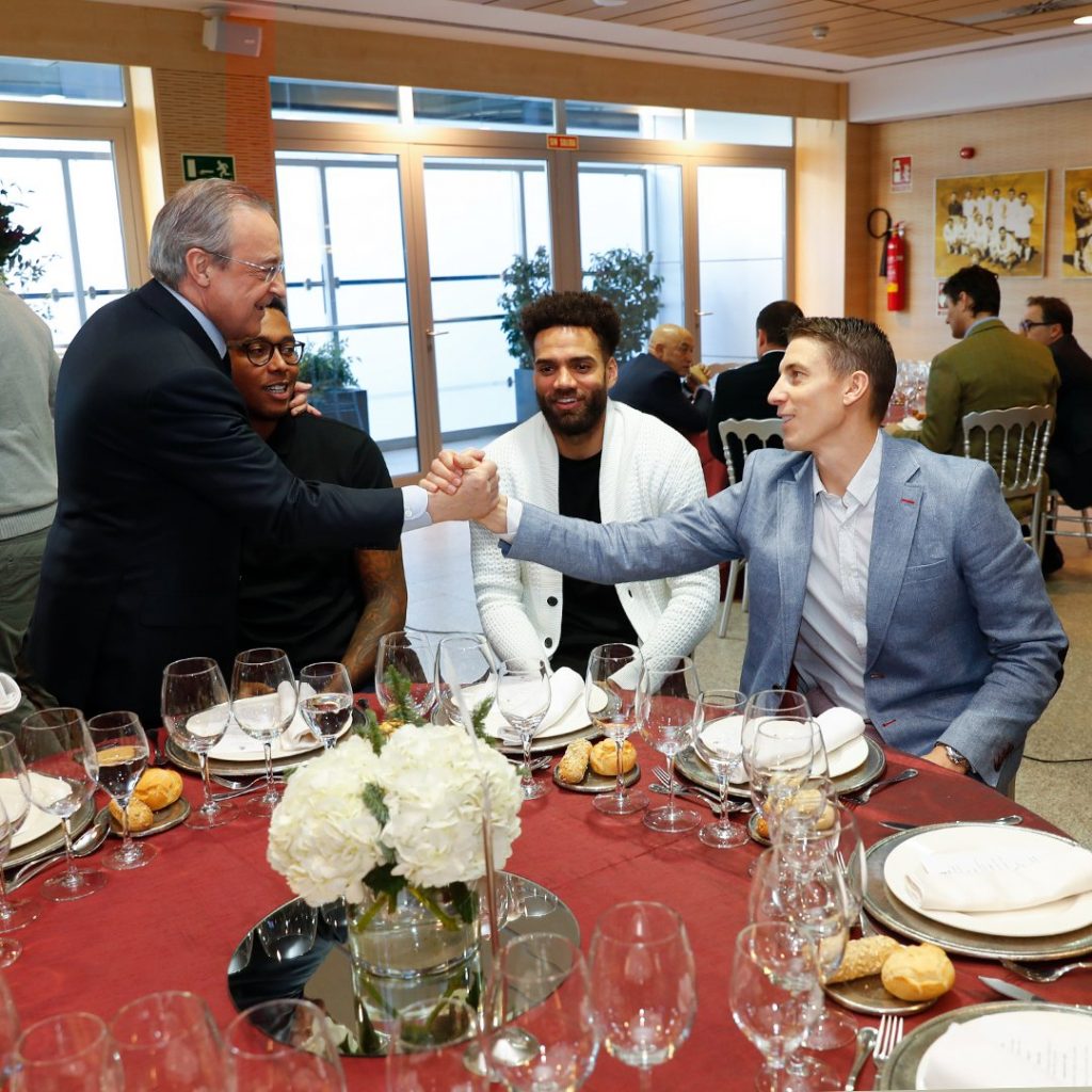 Η Ρεάλ Μαδρίτης, ένα από τα πιο σπουδαία κλαμπ παγκοσμίως, συνηθίζει να αποδεικνύει ότι ο σύλλογος είναι μια ενωμένη οικογένεια. Πιο συγκεκριμένα, το τμήμα του ποδοσφαίρου και αυτό του μπάσκετ δείπνησαν μαζί σήμερα Παρασκευή (14/12) με οικοδεσπότη τον ισχυρό άνδρα της ομάδας Φλορεντίνο Πέρεθ.
