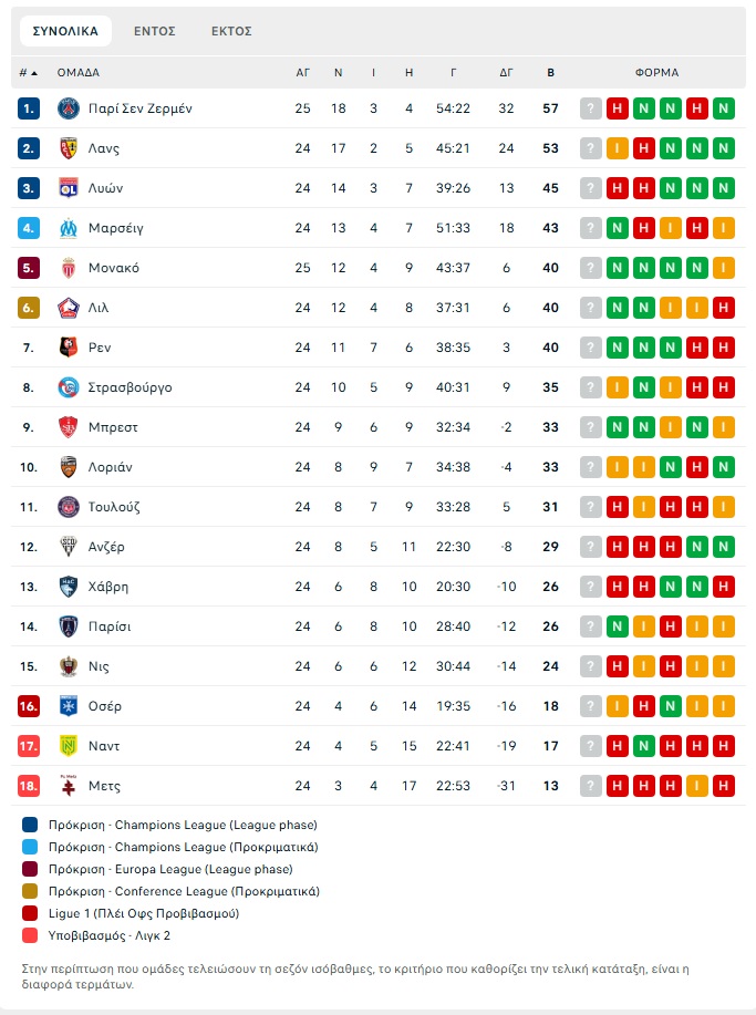 Η βαθμολογία σε 25 αγωνιστικής της Ligue 1