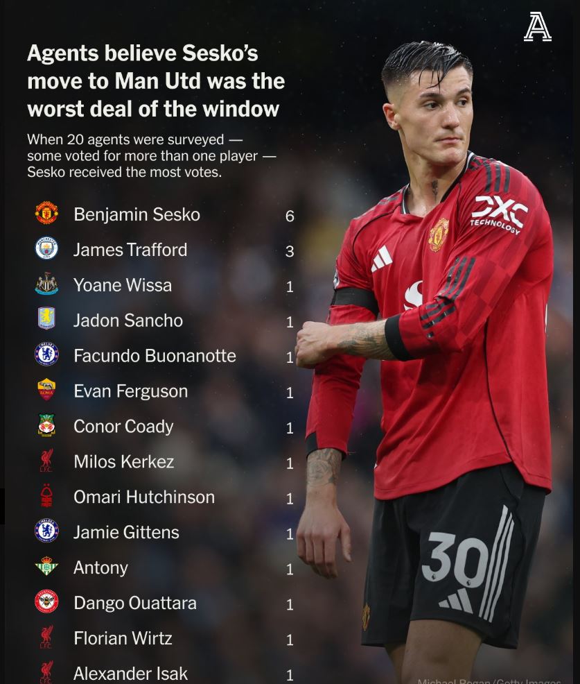 Σύμφωνα με έρευνα του «Athletic», στην οποία συμμετείχαν 20 ποδοσφαιρικοί ατζέντηδες, η μεταγραφή του Μπέντζαμιν Σέσκο στη Μάντσεστερ Γιουνάιτεντ ψηφίστηκε ως η χειρότερη του καλοκαιριού, συγκεντρώνοντας 6 ψήφους, περισσότερες από κάθε άλλη. Ο Σλοβένος επιθετικός μετακόμισε από τη Λειψία στο «Όλντ Τράφορτν» έναντι 76,5 εκατομμυρίων ευρώ, ως μια επένδυση για το μέλλον, αλλά και με την απαίτηση να δώσει άμεσες λύσεις στην επιθετικό πρόβλημα των «κόκκινων διαβόλων».