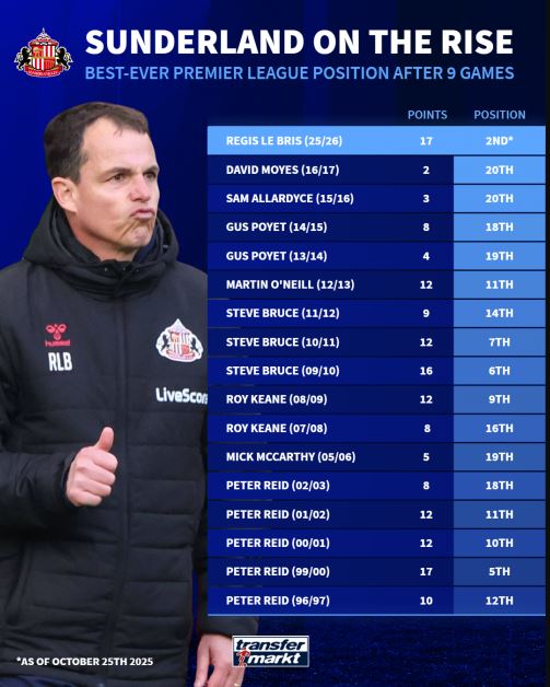 Ο Λε Μπρι έχει μεταμορφώσει πλήρως τις «Μαύρες Γάτες» και έχει φέρει το ελκυστικό στυλ ποδοσφαίρου του στην κορυφαία κατηγορία, ενώ παράλληλα δείχνει τακτική ευελιξία εκτός έδρας. Η Σάντερλαντ επανήλθε στα μεγάλα σαλόνια του αγγλικού ποδοσφαίρου έπειτα από 8 χρόνια, δείχνοντας με εμφατικό τρόπο πως επέστρεψε για να μείνει.