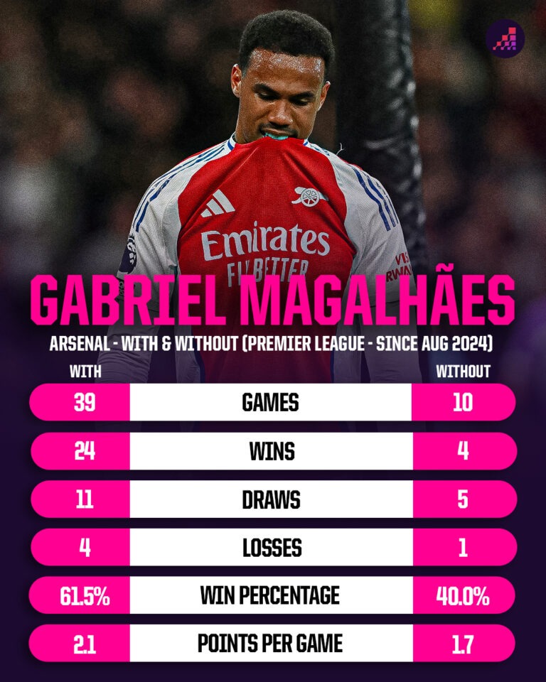 Για την Άρσεναλ, ο κεντρικός αμυντικό Γκάμπριελ είναι εκτός λόγω τραυματισμού και θα λείψει για αρκετό διάστημα. Μία απουσία που στο παρελθόν έχει στοιχίσει στην ομάδα του Αρτέτα. Από την έναρξη της περασμένης σεζόν, η Άρσεναλ έχει κερδίσει το 61,5% των αγώνων της στην Premier League, με τον Γκάμπριελ στην αρχική ενδεκάδα, αλλά αυτό το ποσοστό μειώνεται στο 40% όταν απουσιάζει. Σκοράρουν με περίπου τον ίδιο ρυθμό είτε παίζει είτε όχι (1,8 έναντι 1,7/ματς), αλλά δέχονται 43% περισσότερα γκολ όταν λείπει (0,7 με τον Γκάμπριελ, 1 χωρίς αυτόν/ματς).