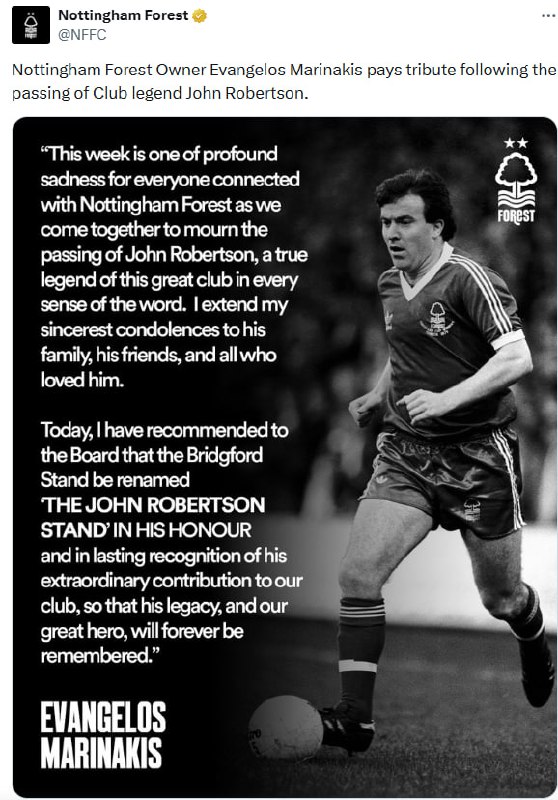 Ο ιδιοκτήτης της Νότιγχαμ Φόρεστ πρότεινε να δοθεί το όνομα του Τζον Ρόμπερτσον σε εξέδρα του «City Ground». «Είναι εβδομάδα βαθιάς θλίψης», δήλωσε ο Βαγγέλης Μαρινάκης.