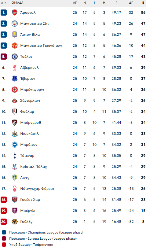 Με αυτή τη νίκη η Άρσεναλ ανέβηκε στους 56 βαθμούς και είναι στο +9 από τη δεύτερη Μάντσεστερ Σίτι (47β.), με τους «πολίτες» να έχουν ένα ματς λιγότερο καθώς θα αντιμετωπίσουν αύριο (8/2, 18:30) τη Λίβερπουλ στο «Άνφιλντ».